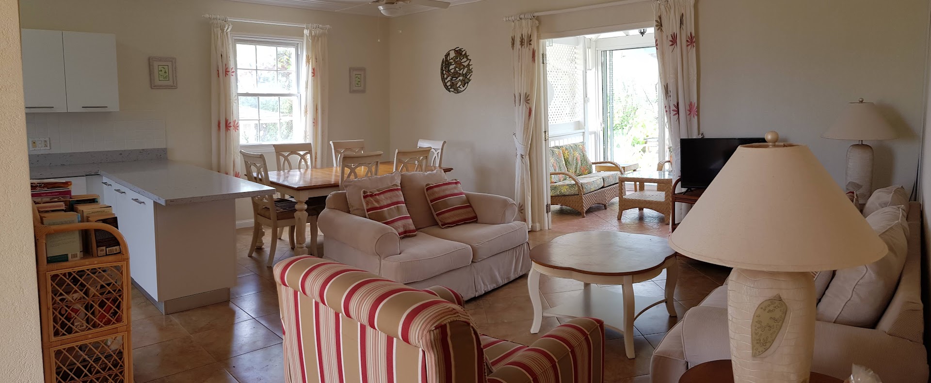 - Large conservatory with dining table and sofa